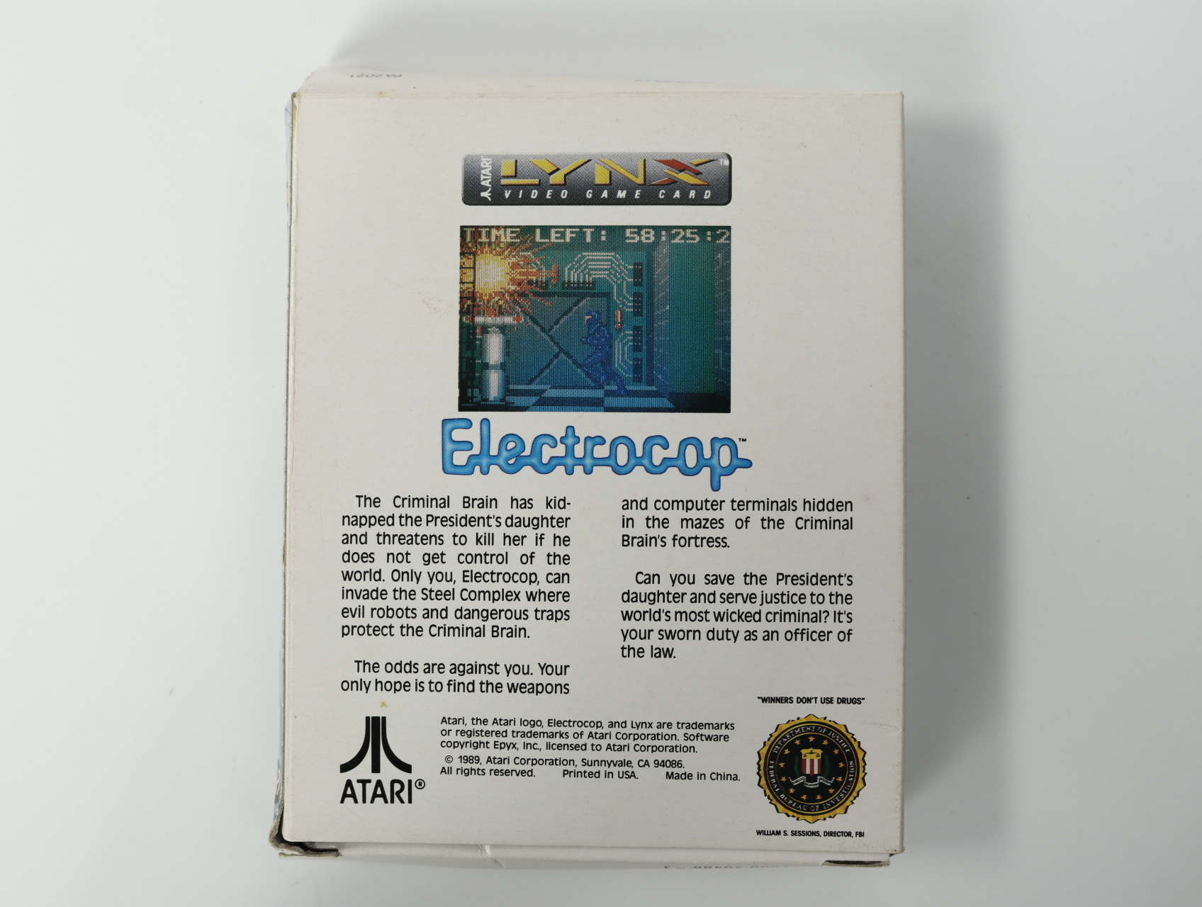 Beschrijving:Electrocop is een actievolle third-person shooter ontwikkeld door Epyx en uitgegeven door Atari Corporation. In dit spel neem je de rol aan van een geavanceerde robotagent die de dochter van de president moet redden uit de handen van de kwaadaardige Criminal Brain. Het spel biedt een futuristische setting met gedetailleerde 3D-omgevingen, waarin je door complexe doolhoven navigeert, vijandige robots bestrijdt en puzzels oplost om verder te komen. Verzamel verschillende wapens en gebruik computerterminals om deuren te openen en extra informatie te verkrijgen. De tijdsdruk voegt een extra laag spanning toe aan de gameplay.