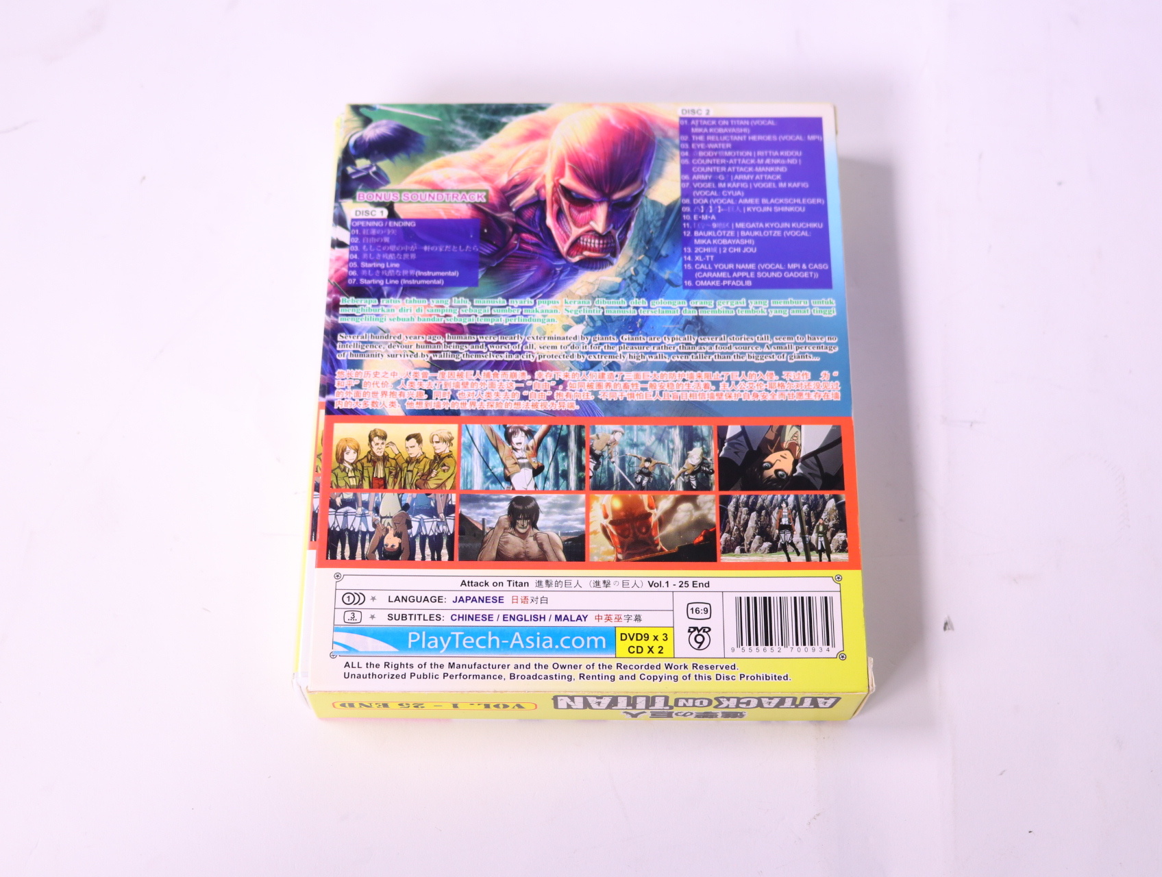 Beschrijving:Attack on Titan 1-25 is een meeslepende anime-serie die zich afspeelt in een wereld waar de mensheid wordt bedreigd door gigantische humanoïde wezens, de Titans. De serie volgt de avonturen van Eren Yeager en zijn vrienden terwijl ze vechten voor hun overleving en de geheimen van de Titans ontrafelen.