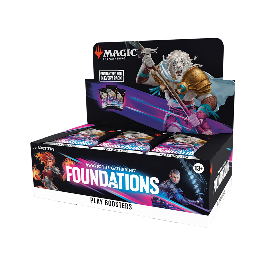 A Booster Box contains 36 play boosters. Each play booster contains 14 Magic: The Gathering cards from Foundations. The composition of a play booster is as follows: