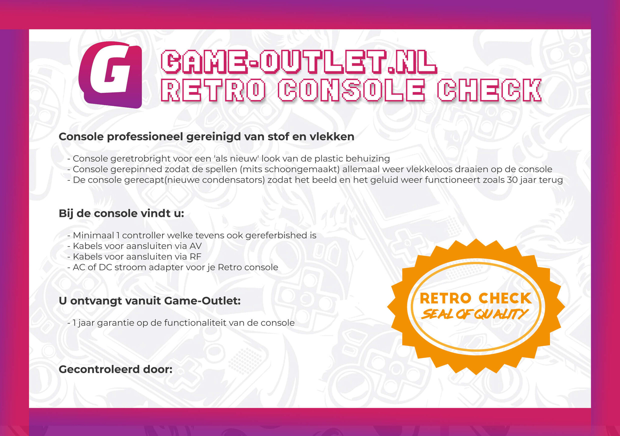 Al onze producten worden zorgvuldig gecontroleerd, professioneel verpakt en snel verzonden. Onze gebruikte retro games (NES, SNES, GameCube, PlayStation, etc.) worden gereinigd, gepolijst en getest op werking. Zo ben jij altijd verzekerd van een goed werkend product.