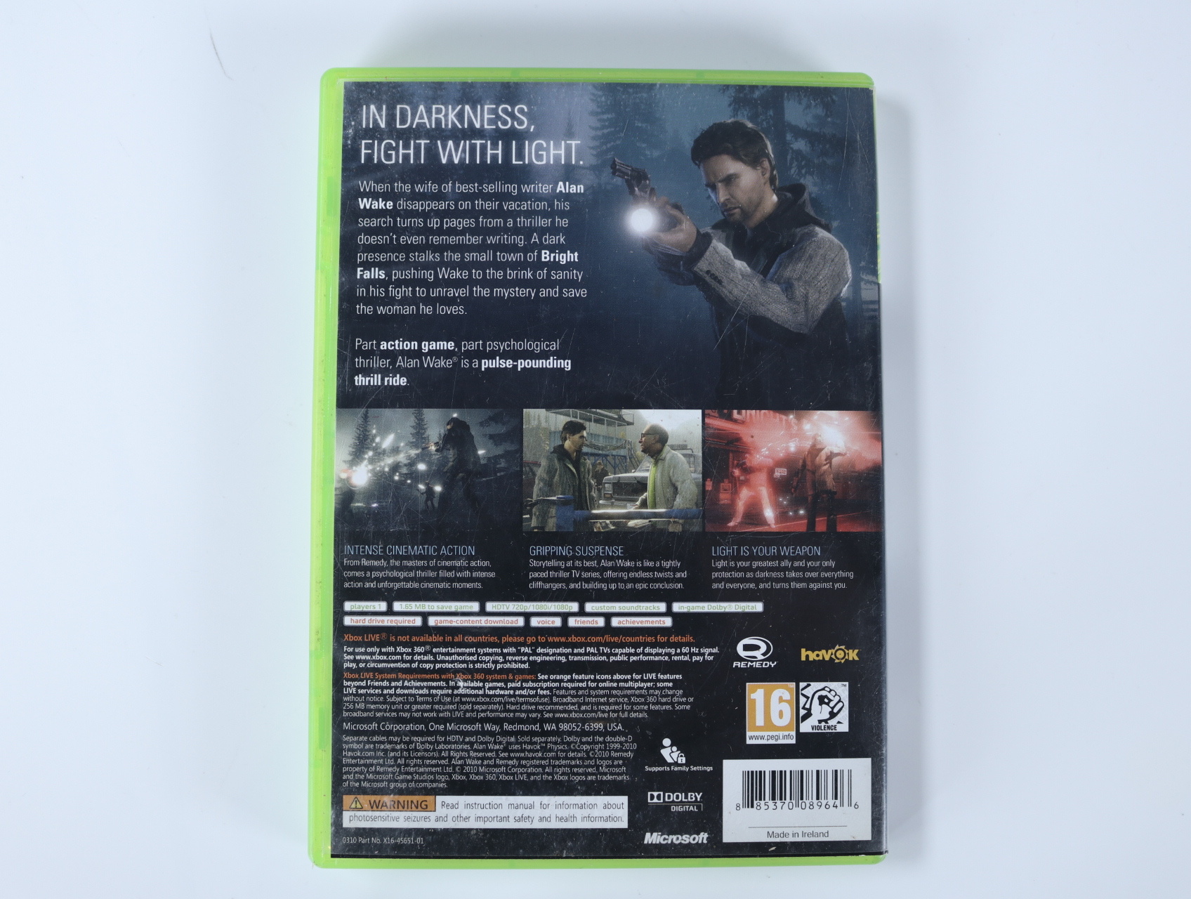 Beschrijving:Alan Wake is een actie-avontuur ontwikkeld door Remedy Entertainment en uitgegeven door Microsoft Game Studios. In dit spel kruip je in de huid van Alan Wake, een bestsellerauteur die op zoek is naar zijn vermiste vrouw in het mysterieuze stadje Bright Falls. Het spel combineert intense actie met een psychologische thriller, waarbij je gebruikmaakt van licht om tegen de duisternis te vechten. Verken diverse omgevingen, los puzzels op en vecht tegen vijanden in een meeslepende verhaallijn.