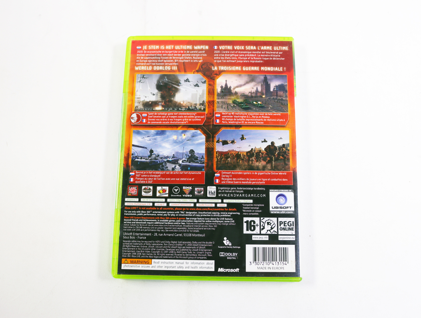 Beschrijving:Tom Clancy's EndWar is een real-time strategy game ontwikkeld door Ubisoft. Je speelt als een commandant die de controle heeft over verschillende legereenheden in een futuristisch conflict. Unieke kenmerken zijn onder andere: voice command gameplay waarmee spelers commando's kunnen geven aan hun eenheden, en een dynamische campagne die zich aanpast aan de keuzes van de speler.