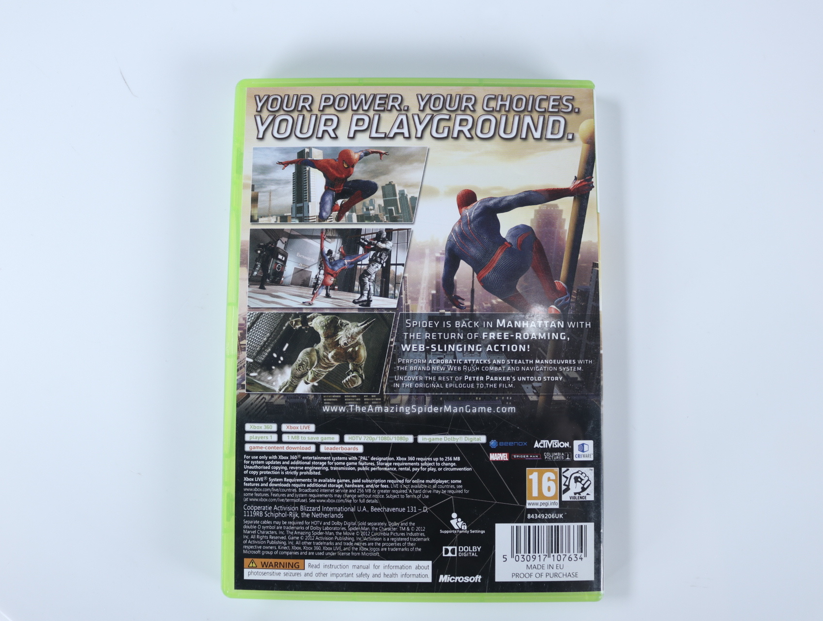 Beschrijving:The Amazing Spider-Man is een actie-avonturenspel ontwikkeld door Beenox en uitgegeven door Activision. Geïnspireerd door de gelijknamige film uit 2012, kruip je in de huid van Spider-Man en verken je een open wereld gebaseerd op Manhattan. Het spel introduceert de 'Web Rush'-mechaniek, waarmee je in real-time navigatie- en gevechtskeuzes kunt maken. Daarnaast kun je klassieke schurken zoals Rhino en Scorpion bestrijden, en diverse alternatieve kostuums ontgrendelen door specifieke taken te voltooien.