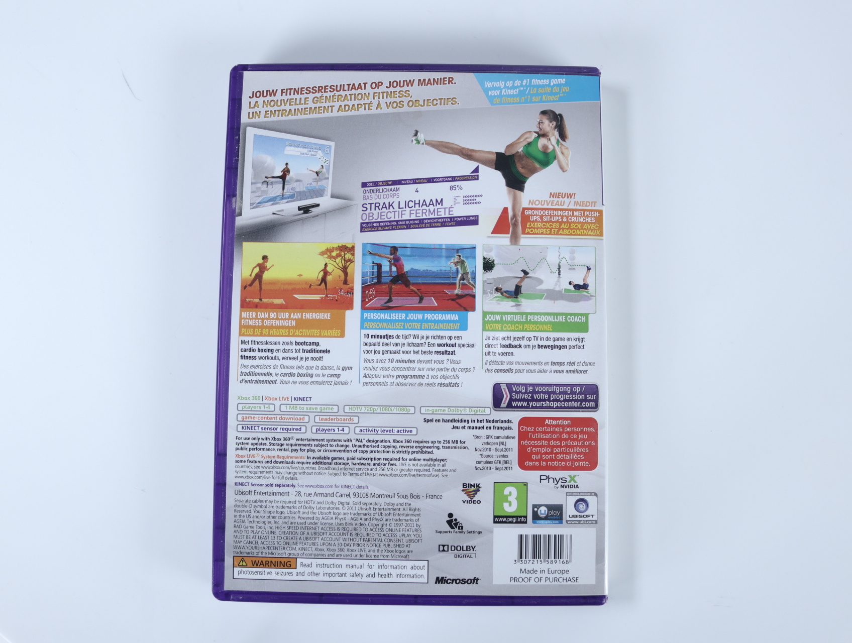 Beschrijving:Your Shape: Fitness Evolved 2012 is een fitnessgame ontwikkeld door Ubisoft Montreal en uitgegeven door Ubisoft. Het maakt gebruik van de Kinect-sensor om interactieve workouts te bieden, waaronder activiteiten zoals bootcamp, cardio boxing, touwtje springen en diverse danslessen. De game biedt een breed scala aan oefeningen en routines, met de mogelijkheid om virtueel door steden als New York, Parijs en Londen te rennen. Dankzij geavanceerde bewegingsregistratie worden ook vloerbewegingen zoals push-ups en sit-ups nauwkeurig gevolgd, met directe feedback om de techniek te verbeteren.