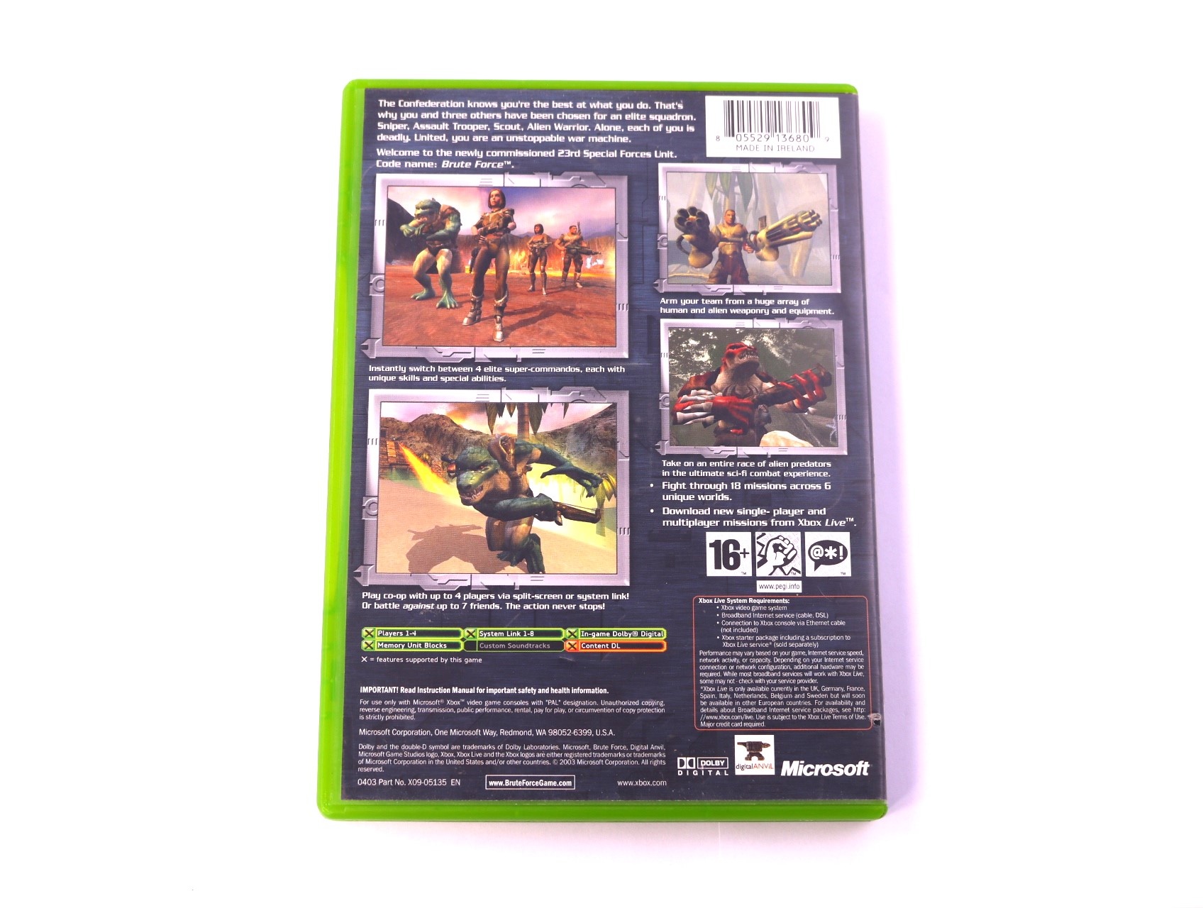 Beschrijving:Brute Force is een third-person shooter ontwikkeld door Digital Anvil. Je speelt als een lid van een elite team dat de strijd aangaat met een kwaadaardige organisatie. Unieke kenmerken zijn onder andere: coöperatieve gameplay, een verscheidenheid aan wapens en de mogelijkheid om verschillende personages met unieke vaardigheden te kiezen.